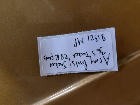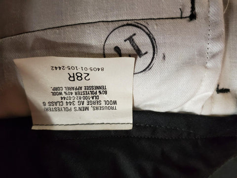 Pants tag reads the following: Trousers, Men's Polyester/Wool Serge AG 344 Class 6 DLA-100-82-C-0744 60% Polyester 40%Wool Tennessee Apparel Corp. 28R 8405-01-105-2442