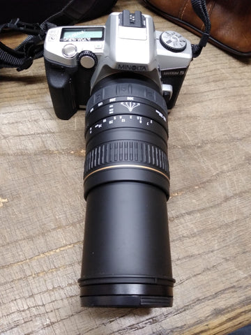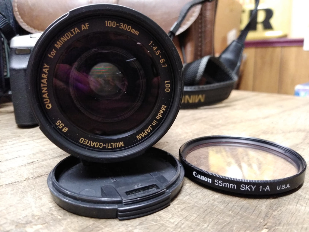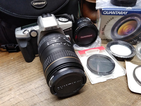 This is a Vintage Minolta Maxxum 5 35mm Film Camera Quantaray 100 300mm, 28 90mm Lenses, 2 Cases, Filters, Light Meter, and More++++!!! Very Good Visual Condition!!! Untested but Very Clean Battery Compartment!!! *** The pictures are a substantial part of the description so please examine all the photos and contact me if you have any questions. We will be happy to save you shipping costs by picking this up at our shop. Thank You 112124- RK-05