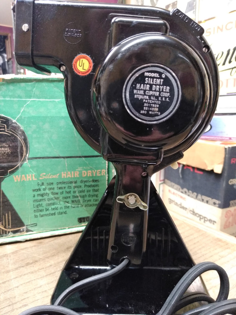 Vtg WAHL Model G Silent Hair Dryer Art Deco Bakelite Original Box Works Good! *** The pictures are a substantial part of the description so please examine all the photos and contact me if you have any questions. We will be happy to save you shipping costs by picking this up at our shop. Thank You 022025- RK-11