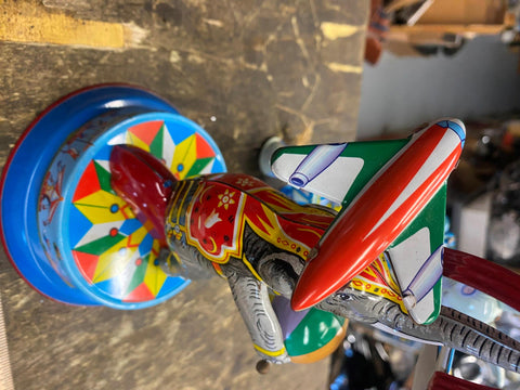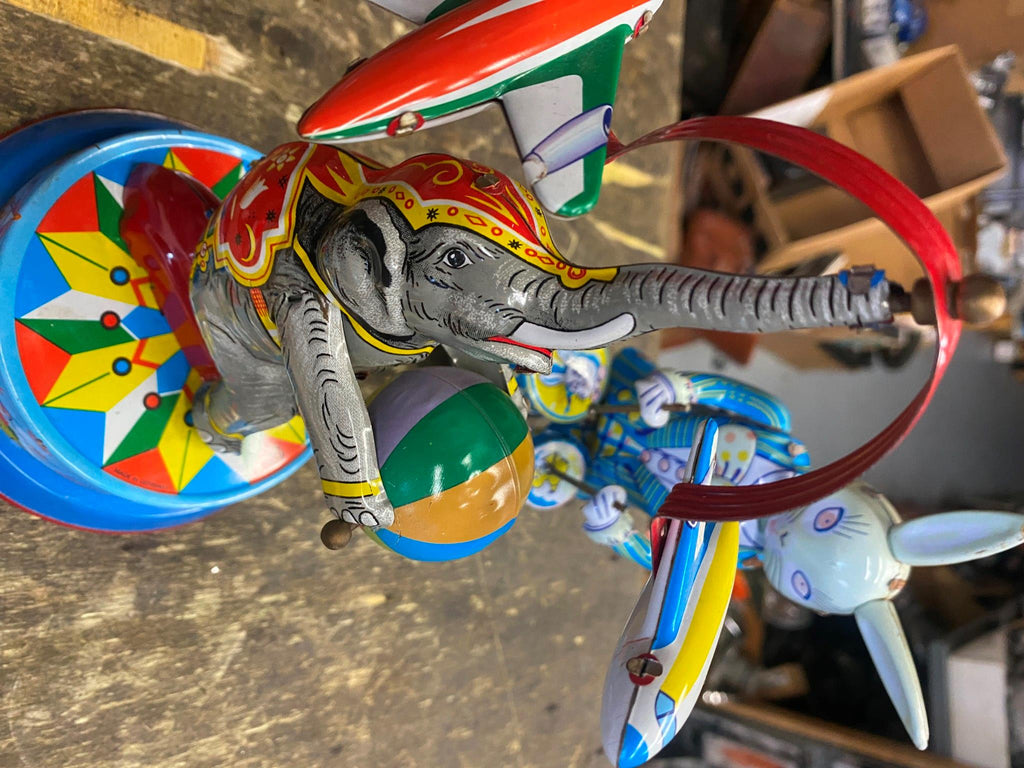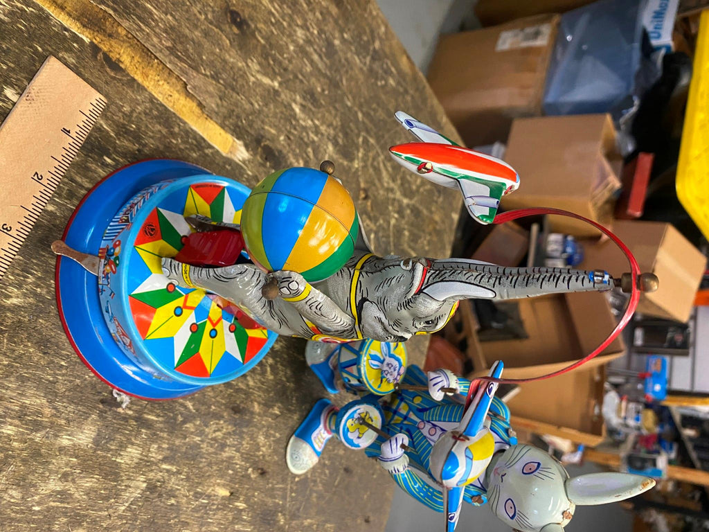 Vtg Wind up Tin Toy Wilesco Circus Elephant Airplane Spinning Globe Litho Works! Germany selling off a lifetime toy collection!